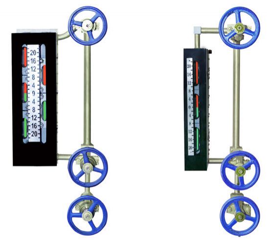 五窗、七窗水位計是在上述優(yōu)點基礎(chǔ)上,研制出在一塊本體上并列設(shè)置兩排窗口,通過光學(xué)原理轉(zhuǎn)換達到在水位計正前方±3o角范圍觀看水位計兩排窗口,可同時觀察到兩排窗口紅綠變化且紅綠分明、界面清晰,可在水位計可視范圍內(nèi)無盲區(qū)連續(xù)監(jiān)視。