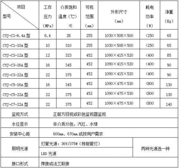 `CYJ型窗式高壓、超高壓彩色液位計是用于各發(fā)電廠、石油化工行業(yè)及各工礦企業(yè)的蒸汽鍋爐或其它壓力容器監(jiān)測水位的一次就地直讀儀表。它是在總結(jié)國內(nèi)外各種透射式雙色水位計優(yōu)點基礎(chǔ)上新研制的長窗式高壓、超高壓雙色水位計,用汽紅水綠顯示液位,無水全紅、滿水全綠。紅綠色界面即為實際水位。可在現(xiàn)場直接觀察也可以配我公司生產(chǎn)的彩色工業(yè)電視監(jiān)視系統(tǒng),在控制室內(nèi)的監(jiān)視器熒屏上遠程監(jiān)測現(xiàn)場實際水位。它與其它雙色水位計相比較,具有如下幾種特點: